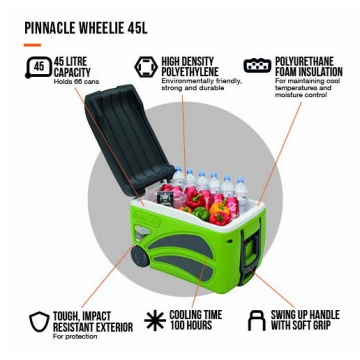 The Vango Pinnacle Wheelie 45L cool box with wheels is ideal for picnics, parties or camping trips. The insulated body with polyurethane foam helps maintains cool temperatures for long periods.
